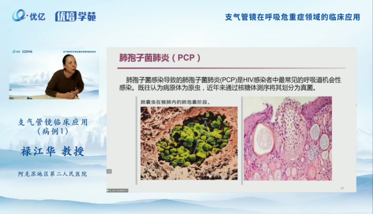祿江華教授分享了兩例臨床病例同時(shí)延伸介紹了PCP病原學(xué)特點(diǎn)、PCP影像學(xué)特點(diǎn)、PCP臨床特點(diǎn)及治療等內(nèi)容。