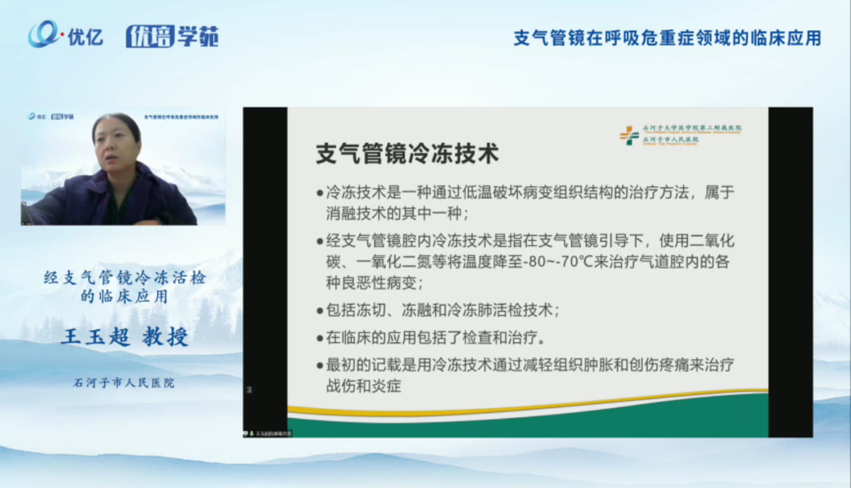王玉超教授分享了支氣管鏡冷凍技術(shù)、冷凍低溫作業(yè)原理、冷凍的作用機(jī)制、冷凍效果影響因素、冷凍治療的優(yōu)勢(shì)、凍融操作方法、經(jīng)支氣管鏡冷凍肺活檢的概念、TBCB的特點(diǎn)、適應(yīng)癥、禁忌癥、并發(fā)癥及處理等內(nèi)容。