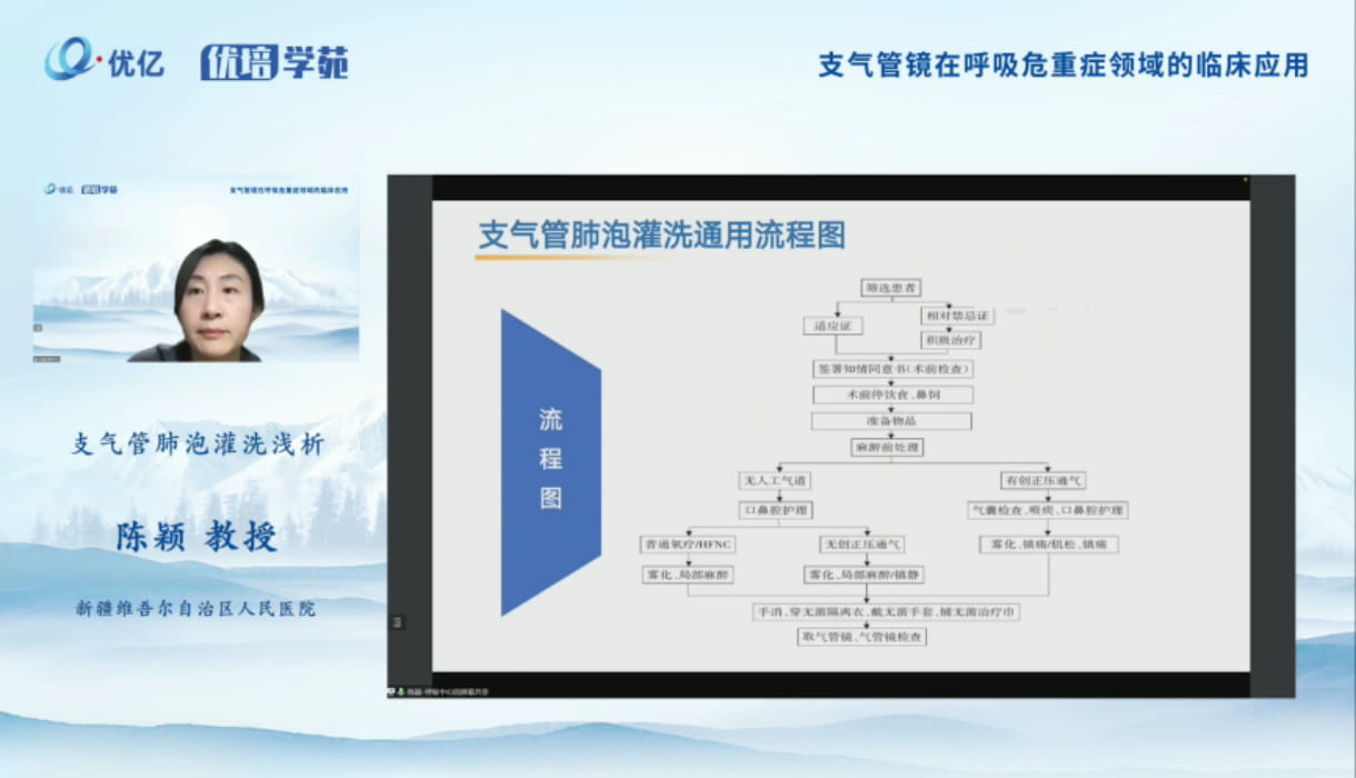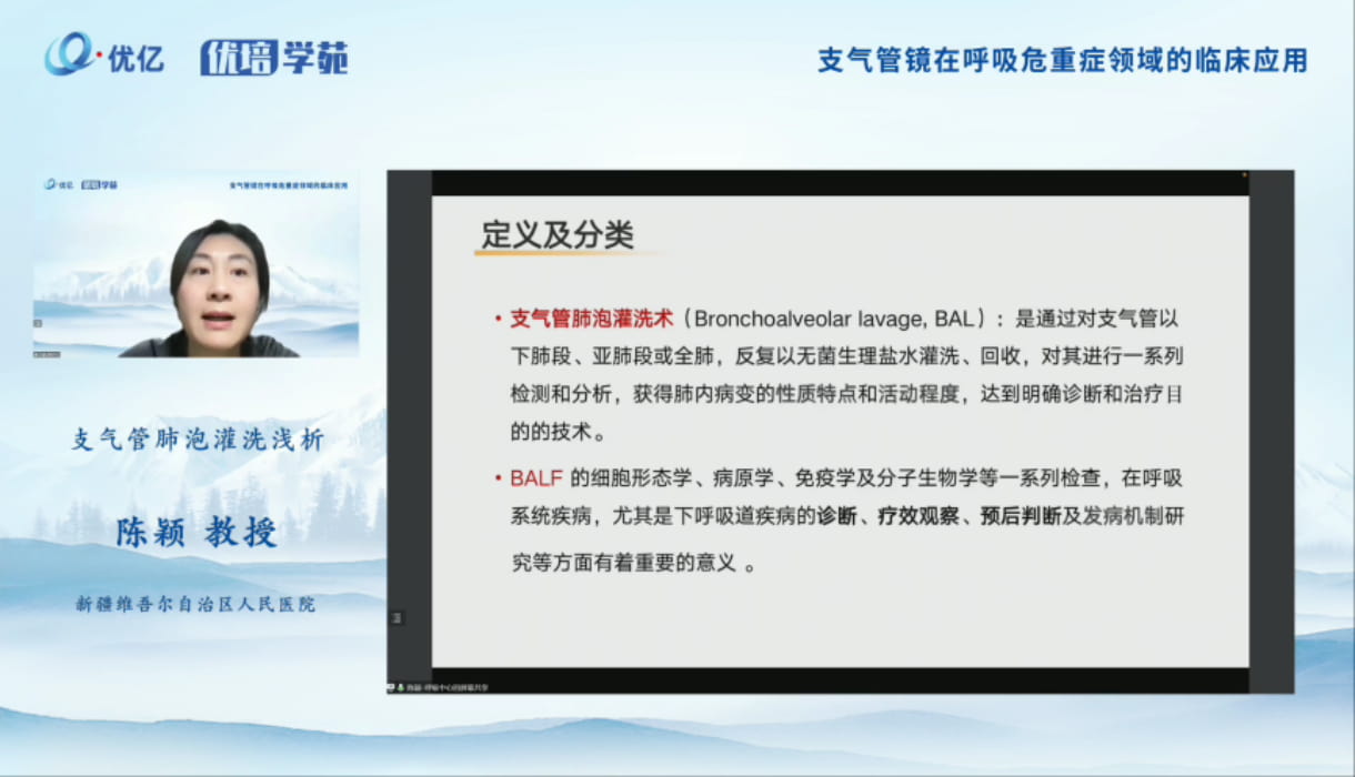 陳穎教授分享了支氣管肺泡灌洗術(shù)的定義及分類、適用范圍與用途、病原檢驗(yàn)?zāi)康?、適應(yīng)癥及禁忌癥、圍操作期的工作、灌洗的操作流程、并發(fā)癥及其處理、BALF處理及解讀等內(nèi)容。